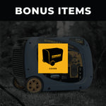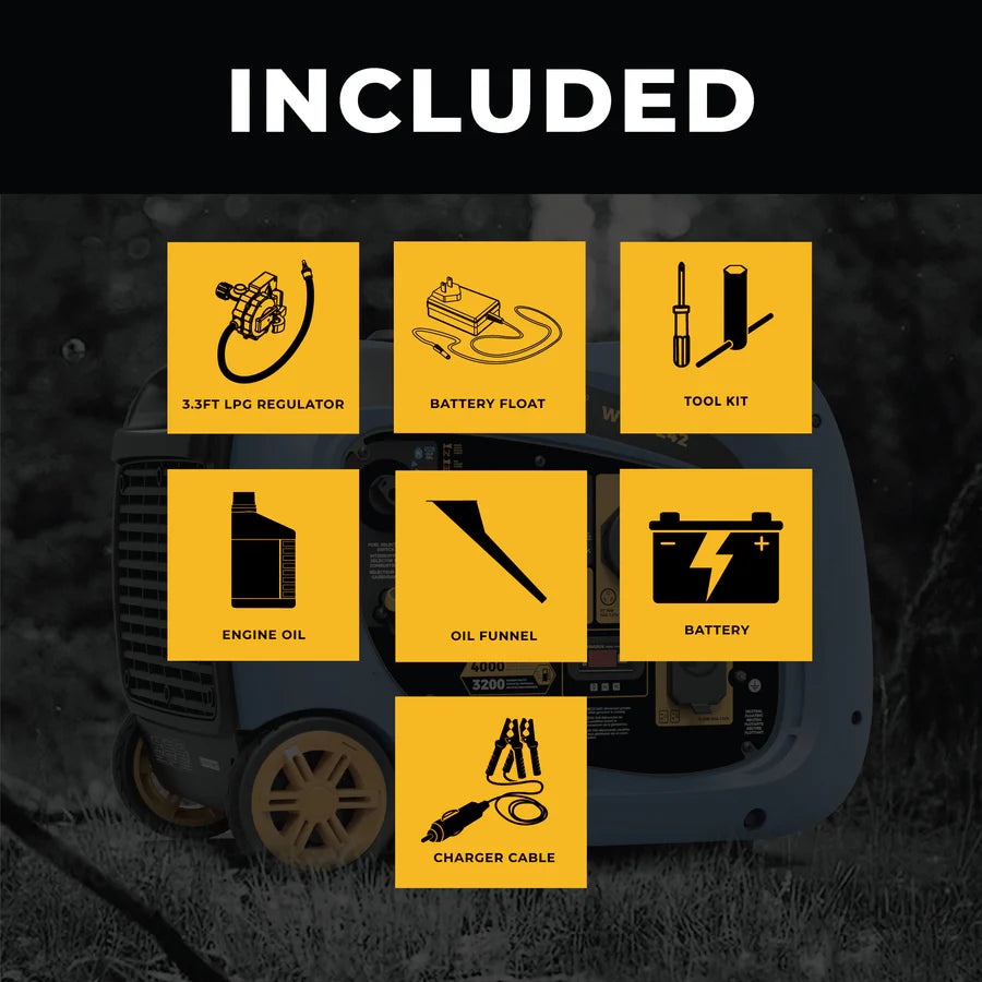 The WH03242 comes with a cover, an engine oil bottle, oil funnel, spark plug wrench, screwdriver, 12V battery cable, LPG regulator (0.8m), floater charger for the battery and quick oil drain.