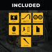 The P09301 comes with an engine oil bottle, oil funnel, remote control and holder, spark plug wrench, and two double open-ended wrenches (10mm x 12mm).