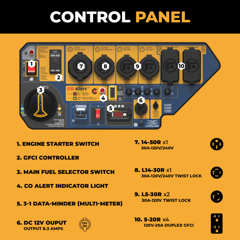 Featuring a substantial 13-gallon fuel tank, the T12071 ensures an incredible 12 hours of uninterrupted power. For a user-friendly experience, we've included a lift hook, a wheel kit, and a folding handle for effortless transport and maneuverability. Safety is our priority with the cutting-edge CO Alert feature, automatically shutting down in case of high carbon monoxide levels.