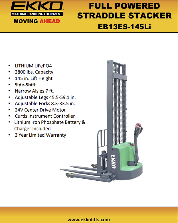 EKKO Lithium Straddle Stacker 2640 lb Cap., 145" Height, Side Shift - EB13ES-145Li