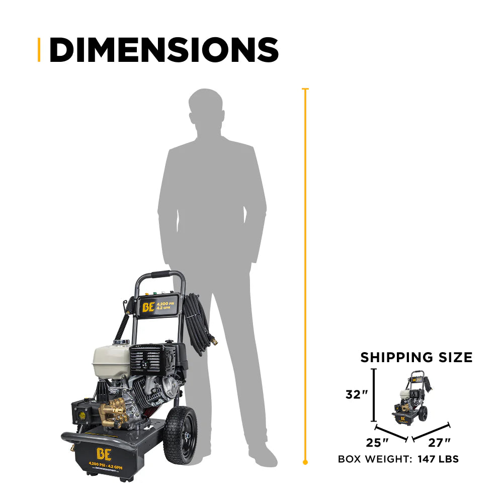 The BE Power Equipment B4213HA Cold Water Pressure Washer is built for the pros and the serious DIY folk who need a pressure washer that really can deliver on the toughest cleaning jobs. With a 4,200 PSI at 4.2 GPM this beast of a washer will give you the pressure and flow to take on anything from messy old driveways to commercial maintenance and just plain dirty situations.
